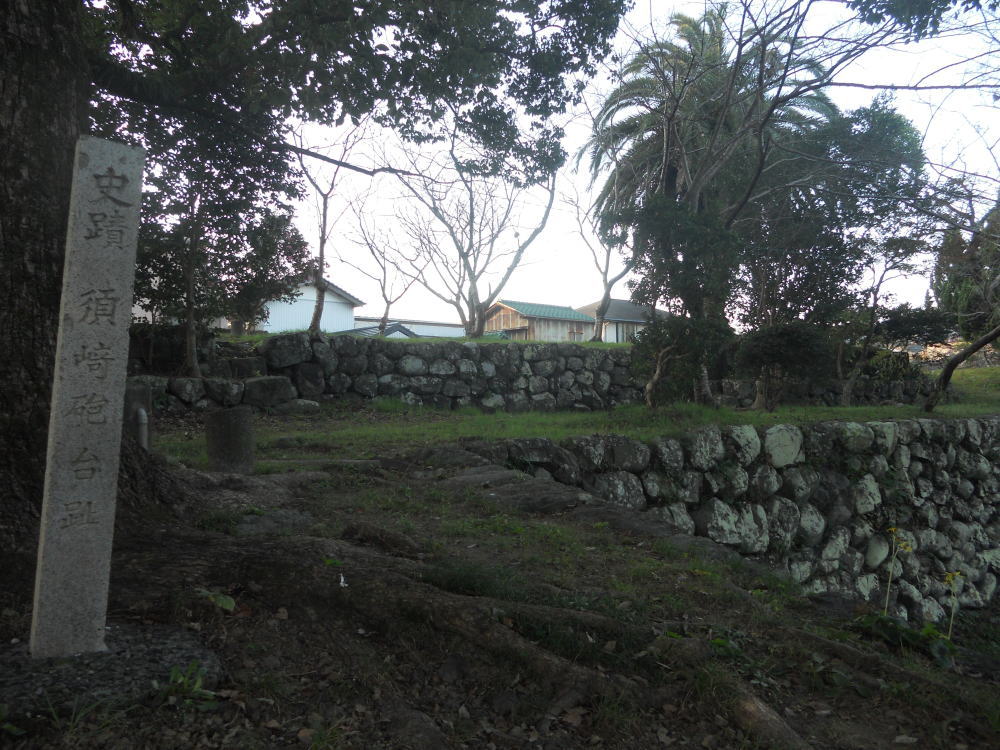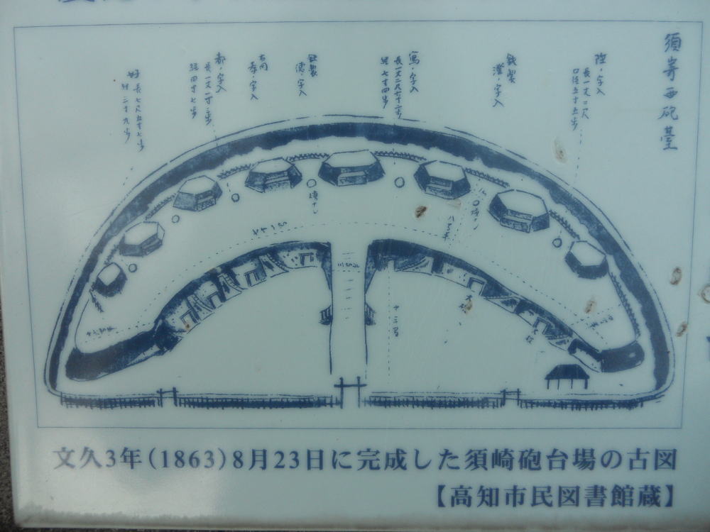 須崎砲台は外国船の襲来に備えて、文久3年(1863)に土佐藩によって築かれました。土佐藩が須崎に築いた砲台は西、中、東の3ヶ所ですが、現存するのはこの西台場のみです。規模が最大で長さ116m、砲門7座、内側弾薬室が7ヶ所ありましたが、明治初年に埋められました。この砲台跡は明治40年、須崎町が払い下げを受け、公園として保存してきたもので、当時使用した砲弾が残っています。<現地案内より参照>