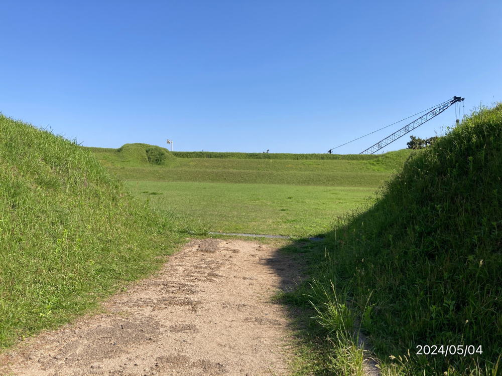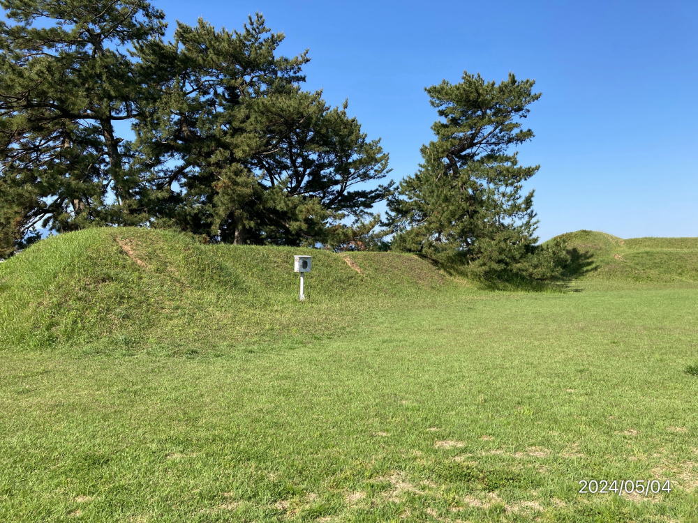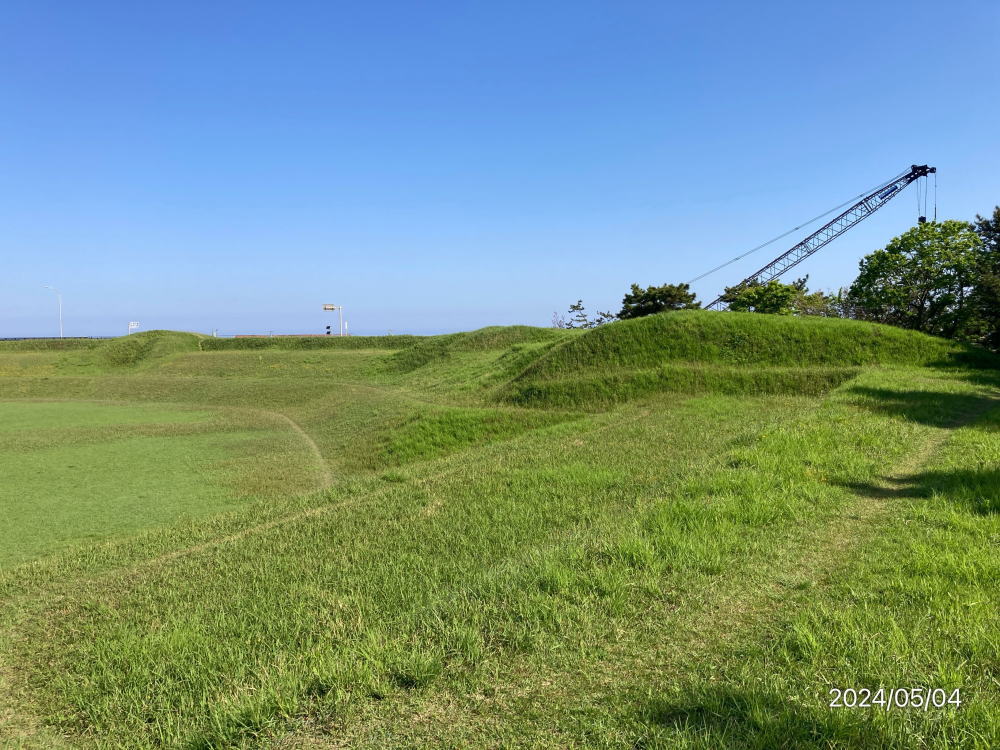 由良台場跡は、藩倉が置かれた由良湊に造られている。この台場の築造は、高島秋帆(しゅうはん)に西洋砲術を学んだ武信潤太郎総指揮のもと文久3年(1863)から行われたが、藩財政が窮乏していたため、藩からの出資金無しで築造工事は進められた。男女問わず16歳から50歳までの農民が動員され、その延べ人数は7万5千余人に及んだとされ、その人夫賃等の費用は中・大庄屋、豪農らの献金に賄われたと伝えられる。文久4年に完成した台場は、東西125m、南北83m、周囲に高く土塁を巡らせ、その高さは4.5mにも及ぶ。台場内側は3段になっており、砲座を中段から上段にかけて設け、そこに計4門の大砲が配置されていた。大砲は、由良湊近くの六尾反射炉で製造されたもので、其々60斤砲、24斤砲、18斤砲、5寸径砲であった。幕末動乱期における鳥取県の歴史を知る上でも資料的価値の高い貴重な史跡である。<現地案内板より>