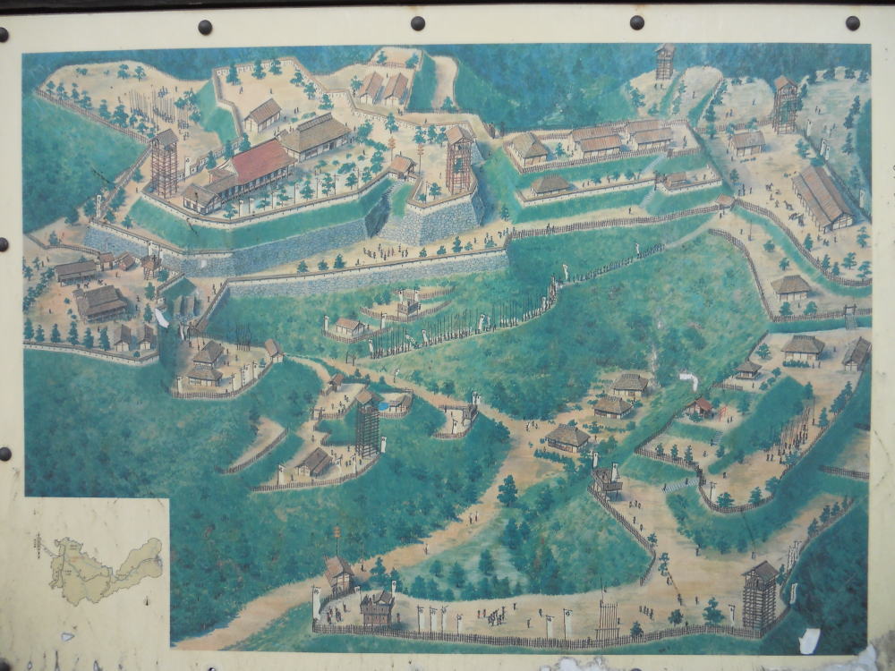 昭和56年(1981)3月の発掘調査によって、7棟の掘立柱建物跡が発見された。本丸東側(上段)では小規模な建物跡(物見櫓)を発見、西側(上段)では桁行18.5m・梁行9.2mの南北に庇、西に正方形の付属屋が付く本格的な、政宗の殿舎ち推定できる建物跡を発見、軍事の中核拠点であったことが確認されている。<現地案内板より>