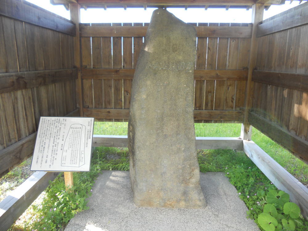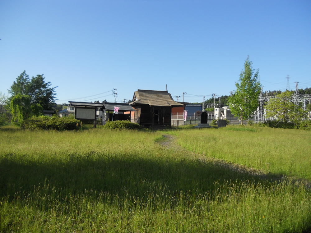 安永3年(1774)銘の石碑に、ここが藤原経清、清衡父子の館跡であり、付近に舟橋の地名や、高水寺跡、延喜式内の鎮岡神社、白旗の池がある、と刻まれている。<現地案内板より>