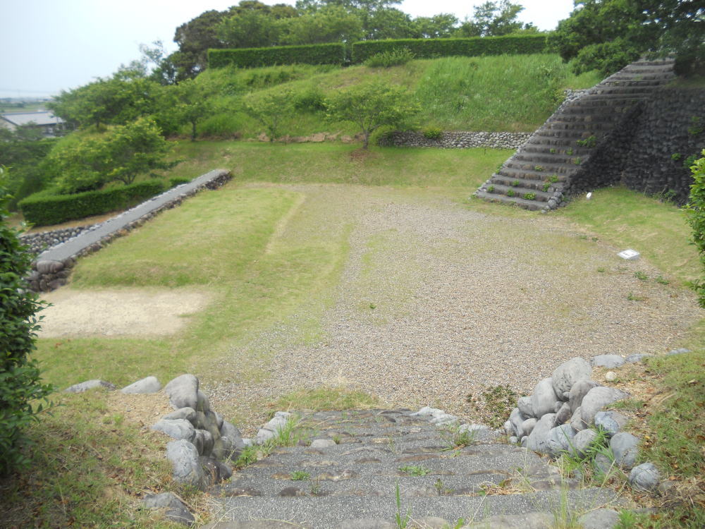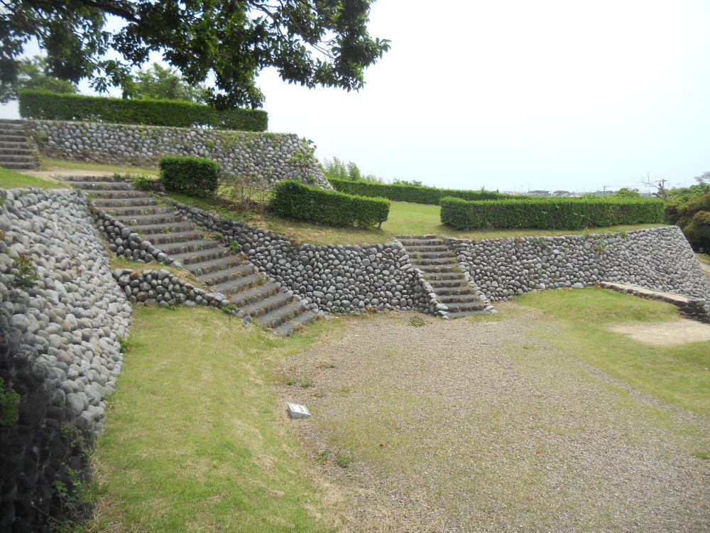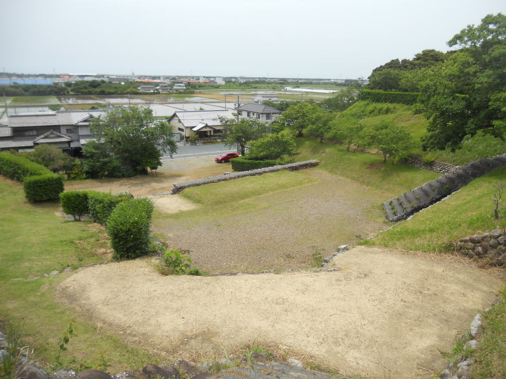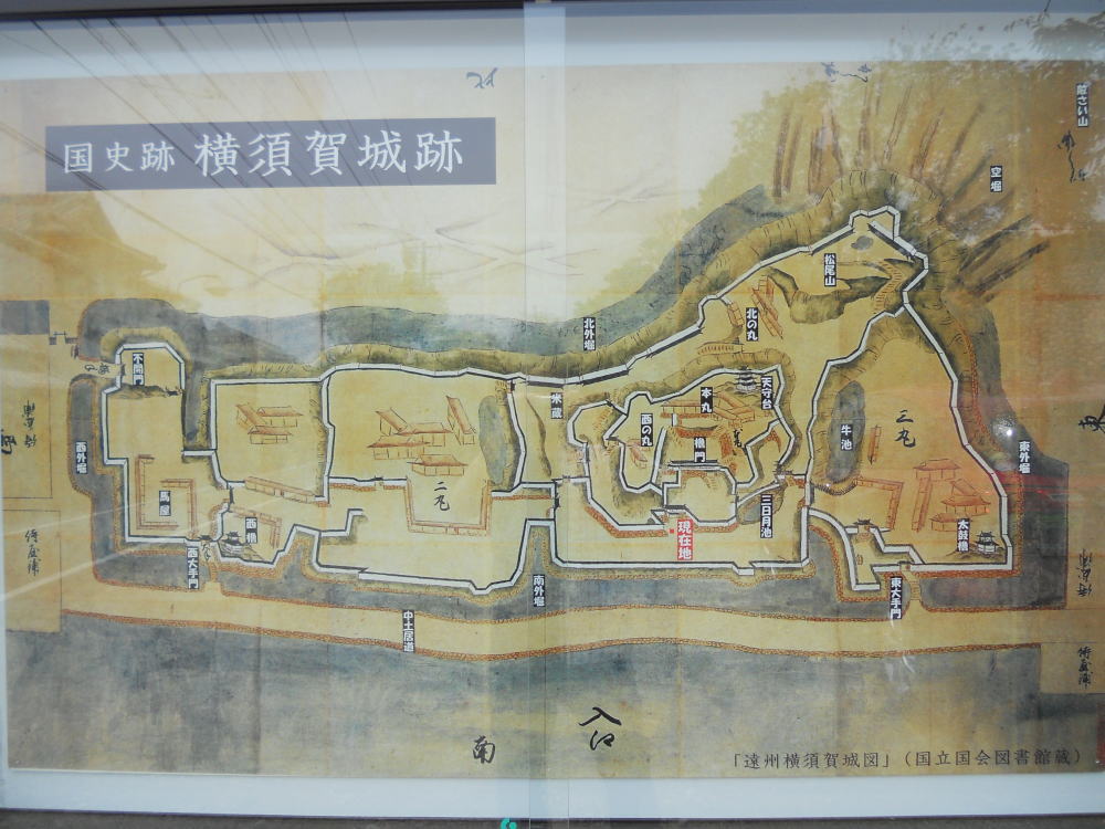 築城当時、この入江は同じ市内にある掛川城の外堀となっている逆川の河口だったと考えられており、当時横須賀城と掛川城は船で直接行き来することが出来たと考えられています。掛川城が陸の大動脈東海道の押さえであったのに対し、横須賀城は小笠山の南を通る浜筋道の押さえであると同時に海上交通の押さえであったと考えられています。