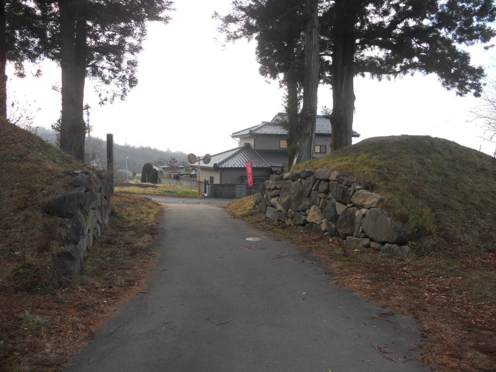 館跡の四方を囲んで築かれた土塁は、周囲520m余あり、外周には堀が巡っていたと推定されている。特に北面は、大沢川が天然の堀となって現在も残っている。また、土塁の南面に、大手門、北面に搦手門があり、南東の角にも小規模な門があったと云われている。