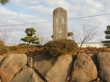 高田へ新城を築いて移ってしまった。城を移した理由は明らかでないが、毎年、雨期になれば関川、保倉川が氾濫するからだと云う誠に短命な城であったが、図によって日本海、関川・保倉川の二河の地理を考えたその規模の大きさを、かつての野面積の石を用いた左の碑壇の石垣を見ることによって、豪壮な城であったことを知ってほしい。<現地案内板より一部編集>