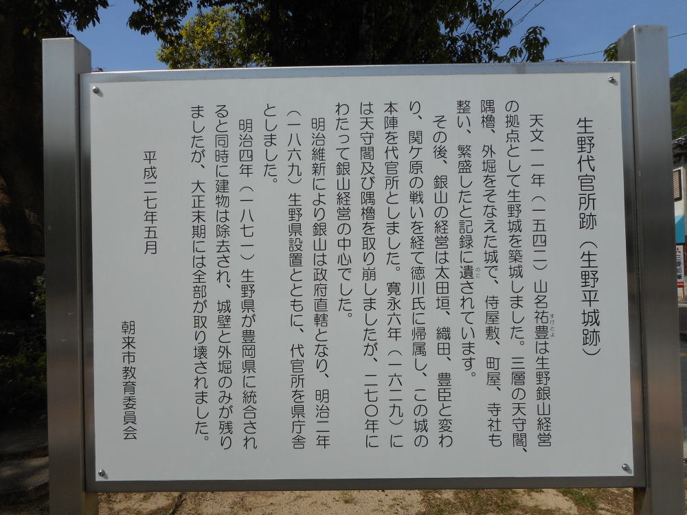 明治4年(1871)生野県が豊岡県に統合されると同時に建物は除去され、城壁と外堀のみが残りましたが、大正末期には全部が取り壊されました。<現地案内板より>