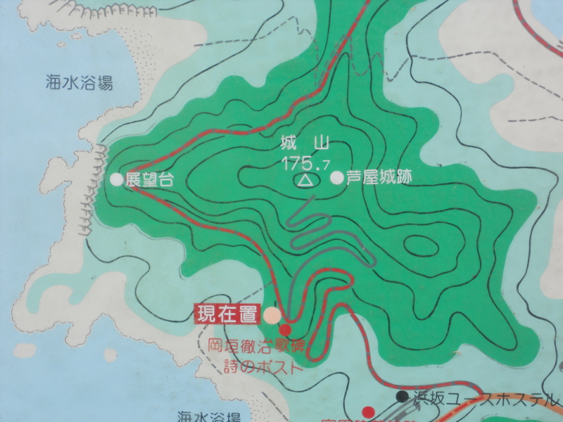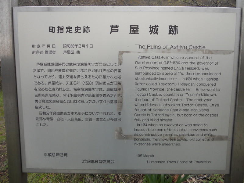 芦屋城は戦国時代の武将塩冶周防守が居城にしていた城で、周囲を断崖絶壁に囲まれた地形は天然の要害となっており、海上交通を押さえるために築かれた城である。芦屋城は、天正8年(1580)羽柴秀吉が但馬を攻めたとき落城した。城主塩冶周防守は、