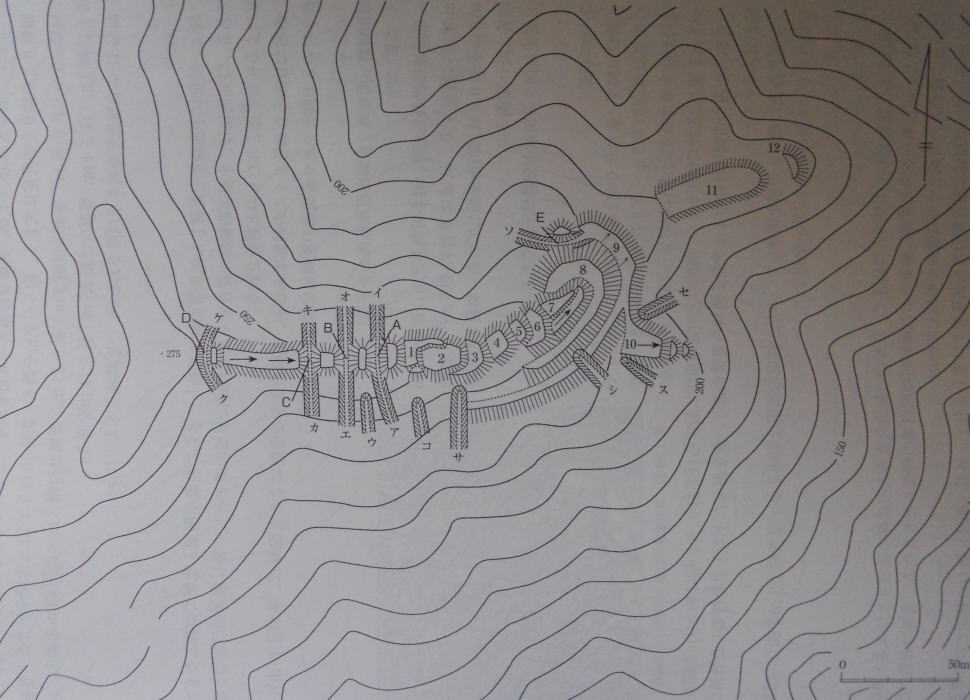 曲輪だけみると地侍クラスの城郭であるが、規模の大きな竪堀によると大改修は、城が宮津・出石・夜久野の3方向を見通せる交通の要衝に位置する為であろう。<豊岡市の城郭集成Ⅱより>