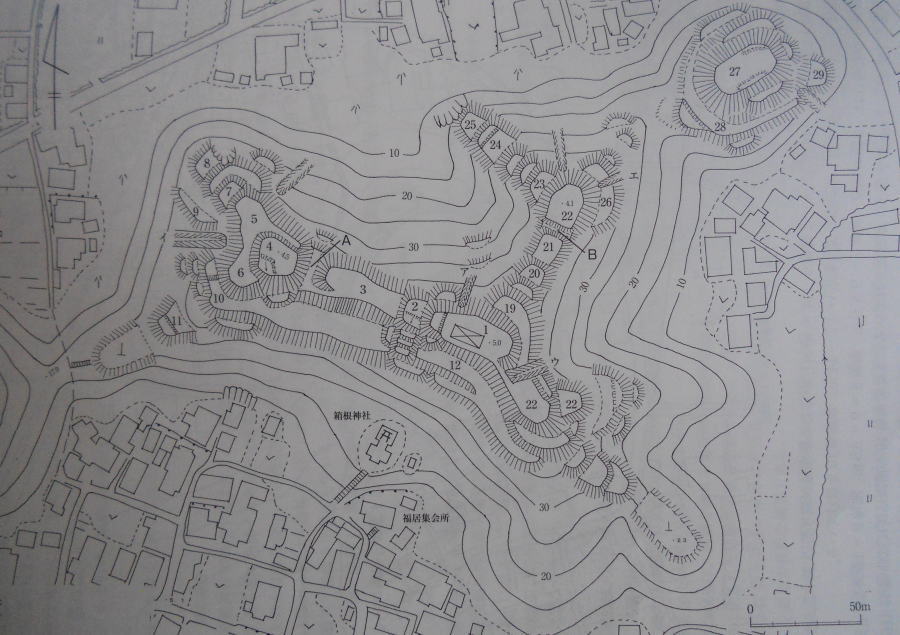 山は低いものの、主郭から派生する粗総ての尾根に曲輪や堀切、竪堀を配置した縄張りである。