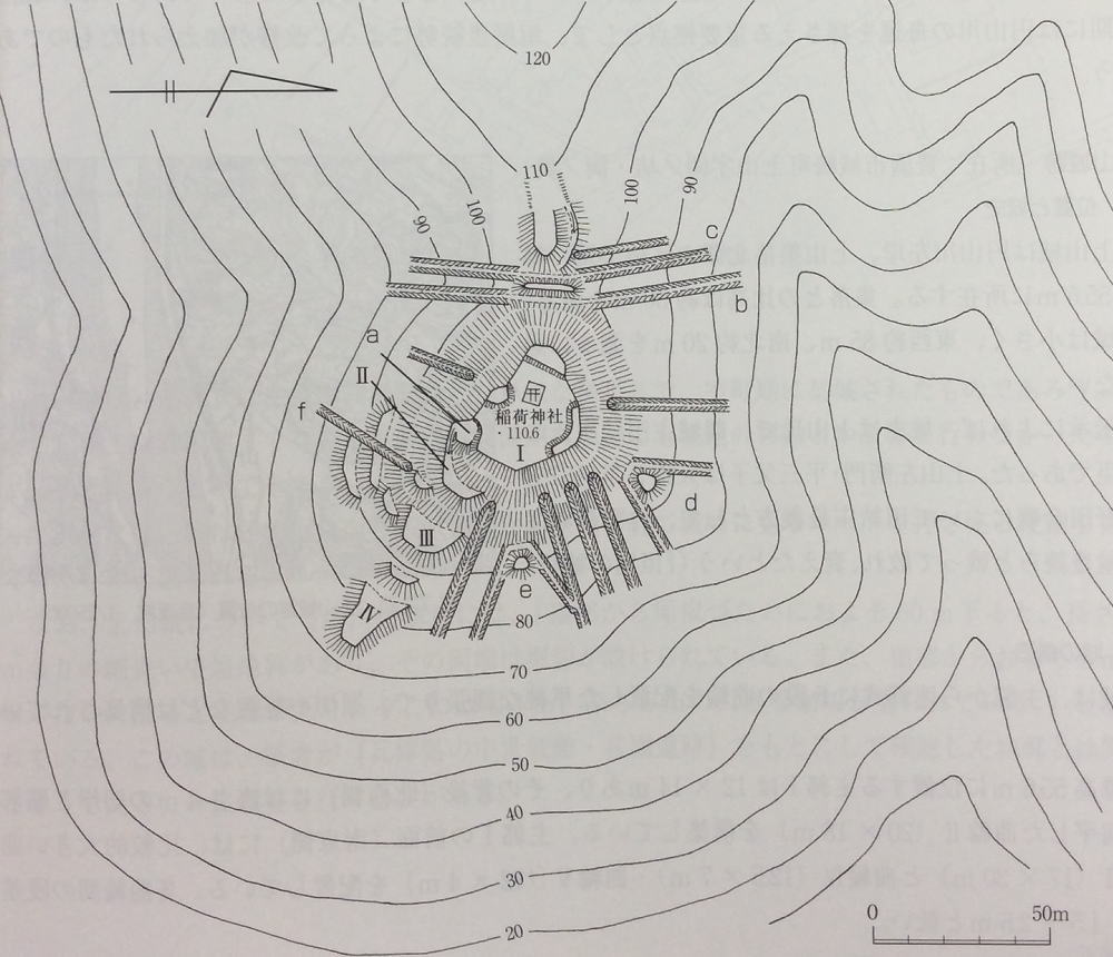 稲荷神社のある主郭Ⅰは東西約35m、南北約29mを測り、高さ1.2~1.5mの土塁と虎口aを構築している。更に主郭Ⅰから延びる主尾根には、4段の曲輪を配している。