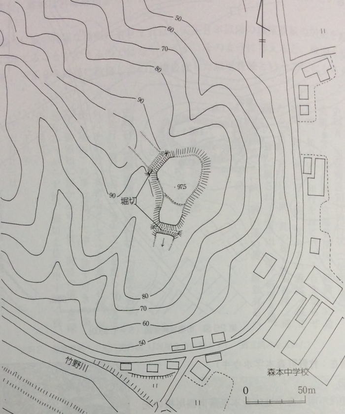 城主や城史は不明。森本城は森本集落南側尾根の先端、標高97.5mに所在し、集落との比高は約65m程ある。