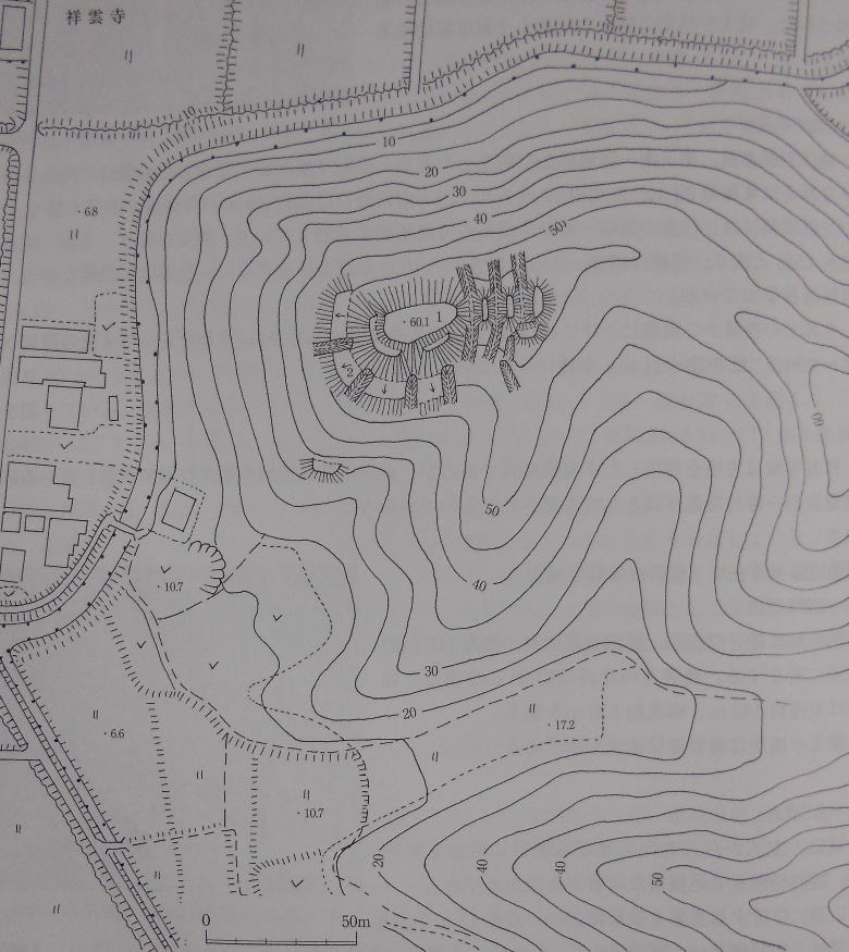 祥雲寺城は古墳を利用した小規模城郭であるが、戦国末期に竪堀や畝状竪堀で改修している。村落領主の一時的な逃げ城として普請されたものであろう。<豊岡市の城郭集成Ⅰより>