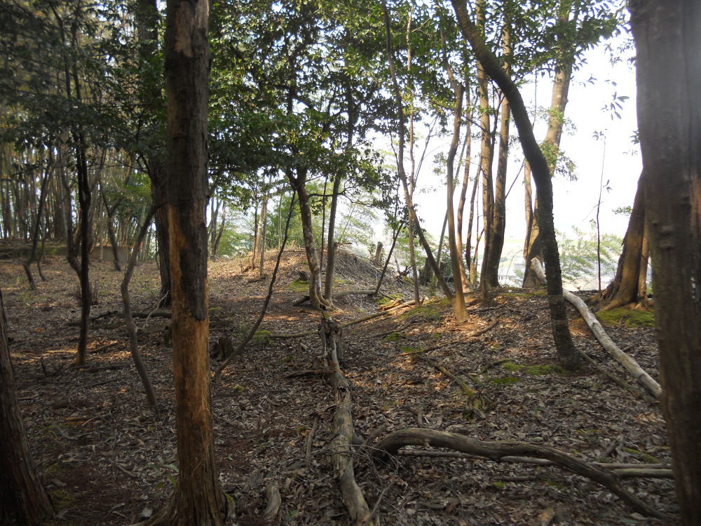 | 1、位置と城史 鳥居城は円山川支流の出石川左岸、鳥居集落の南側、標高44.3mの尾根突端に所在する。集落との比高は約37mある。城域は広く、東西約150m・南北約110mを測る。城主や城史に関する伝承や文献的史料は不明である。 尚、鳥居城は平成20年(2008)国道482号鳥居橋橋梁整備事業に伴い、兵庫県教育委員会によって部分的に発掘調査が実施された(『鳥居城跡』兵庫県教育委員会、2011年)。 2、城の構造 鳥居城は、主郭背後(南側)の尾根鞍部を2つの堀切・竪掘で遮断し、主郭から2方向に延びる尾根に階段状に曲輪群を配置し、土塁や竪掘、畝状竪掘で守備する縄張りである。 主郭1は南北42m・東西16mを測り、北側と西側には幅3〜3.5m・高さ1〜1.5mを測る折れを持つ土塁を構築している。南側には11×8mは測る一段高い平坦面を設けているが、櫓台が想定される。また虎口は北側と東側の2ヶ所に設けられている。 主郭1の南側には深い堀切A(幅16.5m・深さ8m)とやや離れて浅い堀切B(幅4.5m)を設けている。主郭1の南東斜面には2条の竪掘(竪掘ア=幅4m・長さ15m、竪掘イ=幅4.5m・長さ14m)を構築している。 主郭の北東尾根には、3段の曲輪が構築されている。 曲輪2は13×14mを測り、西縁に土塁を配している。発掘調査では、「曲輪の外濠に赤色土がみられ、盛土による土塁が巡っていた可能性」が指摘されているので、曲輪の外濠部全体に盛土を成形の土塁が巡っていたのかも知れない。また、曲輪2の山側裾の表土直下から多量の京都系土師皿、瓦質擂鉢、輸入陶磁、砥石、鉄釘などが出土した。土師皿の大まかな時期は16世紀後半をされている。 曲輪3は13×14m、曲輪4は13×6mを測る(曲輪4は発掘調査で確認された)。竪掘ウは幅2.5m・長さ15mを測る。なお主郭1と曲輪2との段差は約8〜9m、曲輪2と曲輪3との段差は約5mを測る。 主郭1の北西尾根には6段ほどの曲輪を配置している。 曲輪5は10×10mを測る小曲輪であるが、主郭Tと曲輪6とを繋ぐ虎口がよく残っている。主郭1と曲輪5との段差は約6mを測る。 曲輪6は14×11mを測り、北側斜面には小規模な3条の畝状竪掘エ(幅2.5〜3m、長さ10〜12m)が構築されている。曲輪5と曲輪6との段差は約5mを測る。また発掘調査で、畝状竪掘の更に北斜面に岩盤を掘り込んだ竪掘オ(幅・深さ共2.2m)が検出されている。 曲輪7は東西40m・南北17mを測り、曲輪6から延びる土塁と曲輪8(15×8.5m)から延びる土塁で囲繞されている。土塁は幅4〜5m・高さ1〜1.2mを測り、土塁に挟まれた「一折れ」の虎口は幅3mを測る。 曲輪7の北西側には、更に曲輪9(11×5.6m)と曲輪10(17×10m)を配置している。曲輪間の段差は曲輪8・曲輪9間が約4m、曲輪9・曲輪10間が約6〜7mである。 3、まとめ 鳥居城はその規模は小さいながらも、主郭を中心として堅固な普請をしている。折れのある土塁、坂虎口、櫓台、高い切岸をもつ主郭、竪堀、畝状竪堀、土塁囲みの曲輪など、戦国末期特有の防御施設を備えている。 曾て筆者は『此隅山城を考える・第4集』の中で、鳥居城について次のように記している。 鳥居城の築城時期は2段階考えられよう。乃ち、主郭を中心にして階段状に曲輪を配置した時期と、土塁・竪堀・虎口などで改修された時期である。有子山城より発達した土塁・虎口・畝状竪堀等の存在から、天正3〜5年にかけての改修が想定できる。しかし現在では、天正3年以降の畝状竪堀などは在地の手法であるが、主郭1や曲輪7の折れをもつ土塁や虎口などは天正8年以降織豊勢力(有子山城主)に依る普請かもしれない、と考えている。 何れにしても此隅山城や有子山城の支城として日高方面から出石に入る街道を押さえる役割を担っていたことは疑いなかろう。<豊岡市の城郭集成Uより> |
