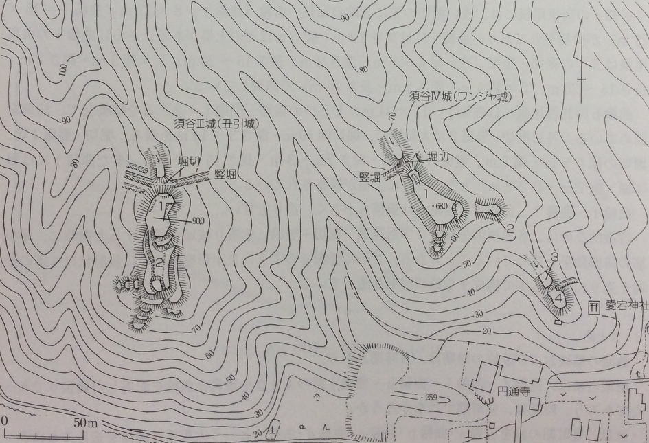 須谷地区に所在する円通寺周辺の尾根には、「須谷城砦群」とでも云える城郭群が存在する。此れ等の小規模城郭はその分布から円通寺との関わりが思考され、円通寺を防禦する為の城郭と判断される。此れ迄に確認できた城郭は、