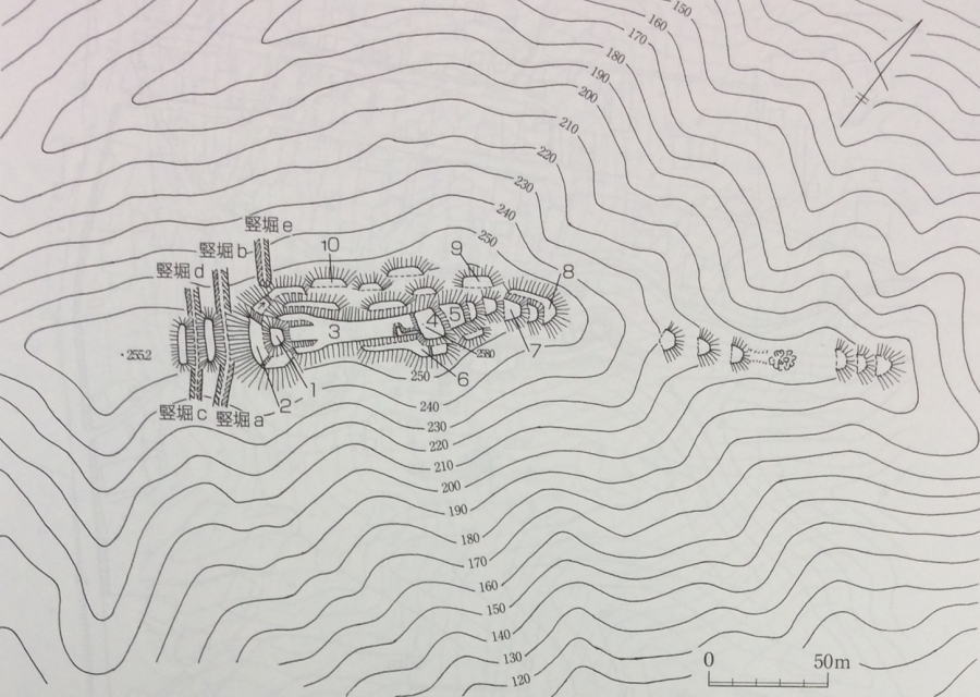 主郭部は、曲輪1・3・4で構成されている。主郭部の周辺は、幅5mを測る曲輪2(帯曲輪)を初めとして、数多くの小曲輪群で防禦されている。主郭部の背後には、6m下がった所に2重の堀切(深さ1.5~6m)・竪堀(幅3.5~4m・長さ15~20m)と竪堀eを構築して、尾根筋を遮断している。主郭部の前面には8段の小曲輪を設け、更に低く尾根筋にも6段程度の削平の甘い小曲輪を配置している。