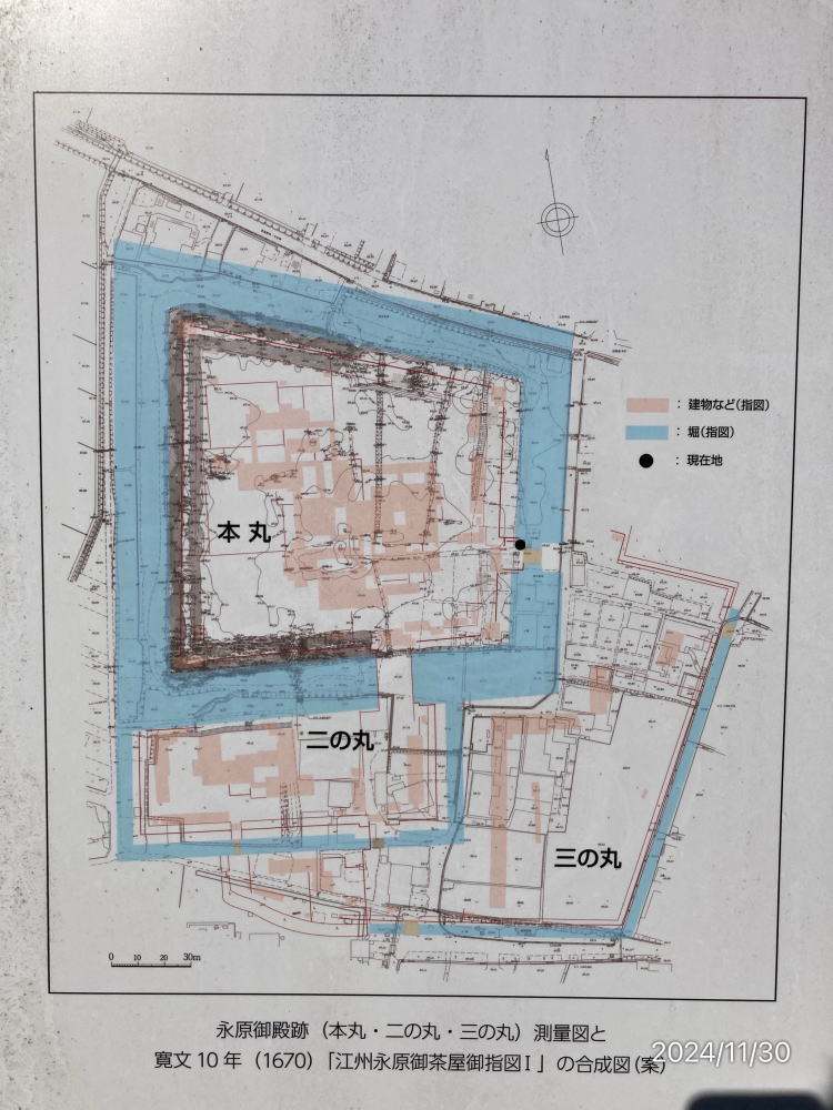 慶長5年(1600)9月、関ヶ原の戦いに勝利した家康は、慶長6年10月、永原に宿泊します(初見)。慶長8年2月、家康は征夷大将軍となり江戸に幕府を開きますが、大坂城の豊臣秀頼や豊臣恩顧の諸大名が偏在する西国、京都の天皇に対処するため、屡々往来します。この際、用いた城館が永原御殿で、家康が7回、秀忠が3回、家光が2回利用しました。御殿を作事した京都大工頭・中井家の指図(絵図)によると、家康・秀忠が使用した御殿(古御殿)は、本丸と南に突き出た二の丸から成っていました。