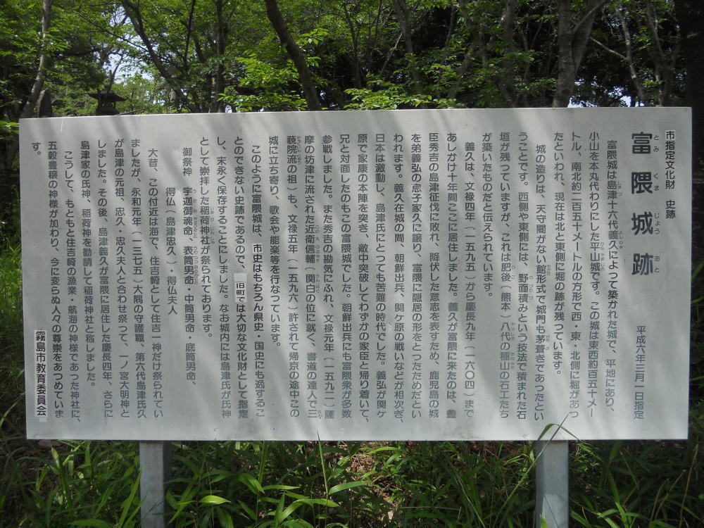 このように富隈城は市史はもちろん県史・国史にも逸することのできない史跡であるので、旧町では大切な文化財として指定し、末永く保存することにしました。なお城内には島津氏が氏神として崇拝した稲荷神社が祭られております。